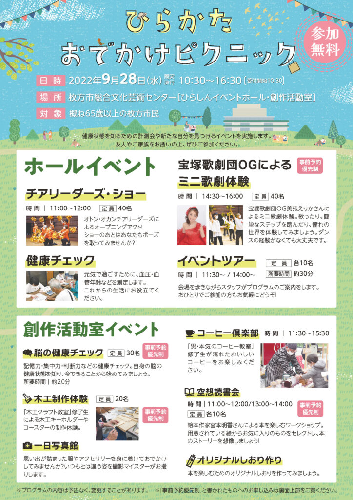 9月28日は概ね65歳以上の枚方市民の方を対象とした趣味を広げるイベント「ひらかたおでかけピクニック」の一講師として、枚方市総合芸術文化センターにて2つのワークショップを開催させていただきました。